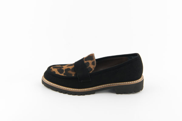 Velours noir, plateau leopard, doublure entièrement agneau, semelle gomme ultra légère et flex pour un visuel élégant , talon de 3cm.