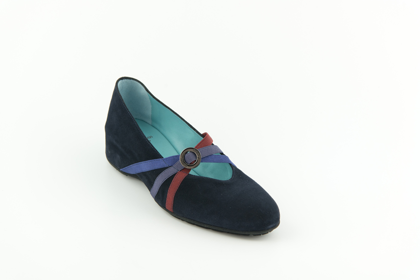 Veau velours bleu, doublure entièrement agneau, cousu sacchetto, semelle gomme naturelle, talon compensé de 3cm, élastiques multicolores.