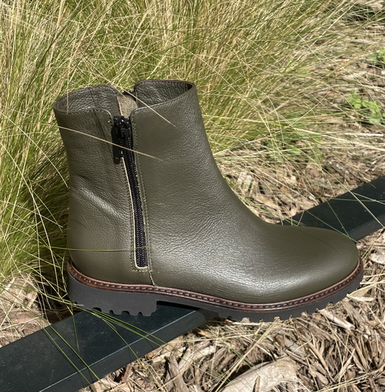 Veau grainé ultra souple kaki, doublure entièrement cuir, semelle de gomme ultra souple et flex, talon de 2,5cm, 1 zip de chaque côté.