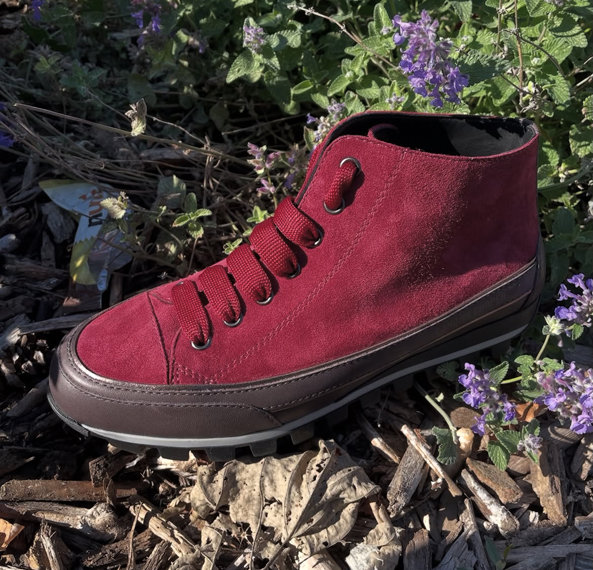 Veau velours bordeaux, agneau taupe , doublure entièrement agneau, semelle intérieure amovible cuir avec amorti, semelle gomme naturelle, talon de 4cm rehaussé par l’intérieur, zip sur le côté.
