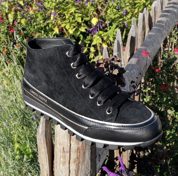 Veau velours noir et agneau noir, liseré platine , doublure entièrement agneau, semelle intérieure amovible cuir avec amorti, semelle gomme naturelle, talon de 4cm rehaussé par l’intérieur, zip sur le côté.
