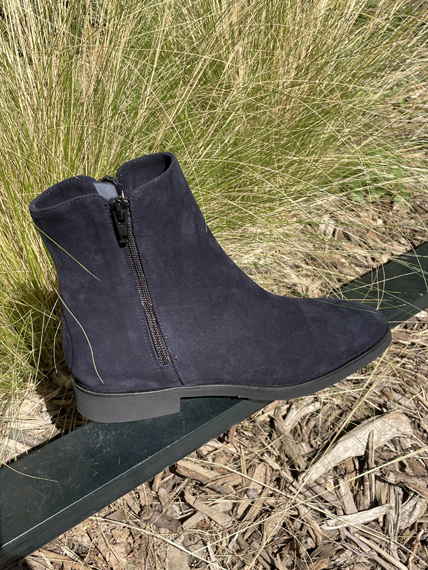 Veau velours bleu waterproof, doublure entièrement cuir, 1 zip de chaque côté, semelle gomme ultra light et souple, talon de 3cm.